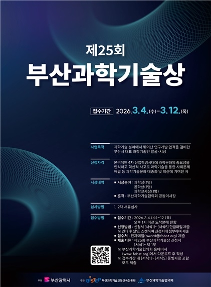 부산시가 주최하고 부산과학기술고등교육진흥원(BISTEP)과 부산과학기술협의회가 공동 주관하는 ‘제25회 부산과학기술상’이 오는 3월 4일부터 2026년도 수상 후보자 모집에 들어간다.