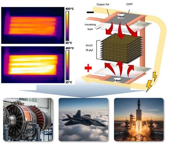 성동기 부산대 교수는 “탄소섬유 복합재료는 높은 강도를 가진 경량소재로서 다양한 산업에 적용되고 있지만, 내열성이 낮아서 고온 환경에서의 적용성은 제한적이다. 이번 연구에서는 탄소나노튜브 필름을 활용한 새로운 줄가열 공정을 통해 고내열 탄소섬유 복합재료를 기존 기술 대비 낮은 에너지로 제조하는 공정 기술을 제안했다. 특히 유리전이온도 362 ℃ 수준의 고온 안정성과 제빙·전자파 차폐 기능을 하나의 구조 내에 통합함으로써, 항공기 외장재와 우주 구조체 등 극한 환경용 차세대 구조물에 적용 가능한 핵심 기술로 발전할 수 있을 것으로 기대된다”고 말했다.