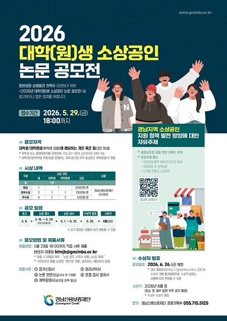 경남신용보증재단은 창립 30주년을 기념하고 소상공인 정책 연구 저변 확대를 위해 ‘2026년 대학(원)생 소상공인 논문 공모전’을 개최한다고 11일 밝혔다.
