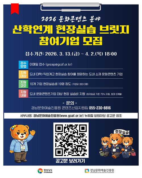 경남도와 경남문화예술진흥원은 지역 콘텐츠 산업의 인력난 해소와 청년 인재 양성을 위해 '2026 문화콘텐츠 분야 산학연계 현장실습 브릿지 사업'을 추진한다고 17일 밝혔다.