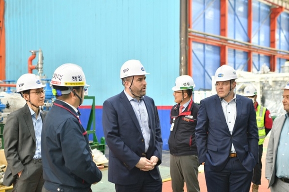 대표단은 이날 SB선보 다대공장과 구평공장을 차례로 둘러보며 액화천연가스(LNG) 연료공급 시스템(FGSS)과 재액화 시스템 등 친환경 선박 기자재 생산 공정을 점검했다. 아울러 수전해 기반 수소 생산 기술 등 회사가 추진 중인 차세대 에너지 사업에도 높은 관심을 보였다.