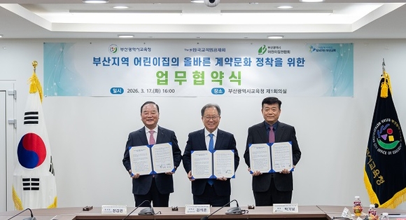 시교육청은 지난 17일 교육청 회의실에서 한국교직원공제회, 부산시어린이집연합회와 함께 어린이집의 올바른 계약문화 정착을 위한 업무협약을 체결했다고 밝혔다.