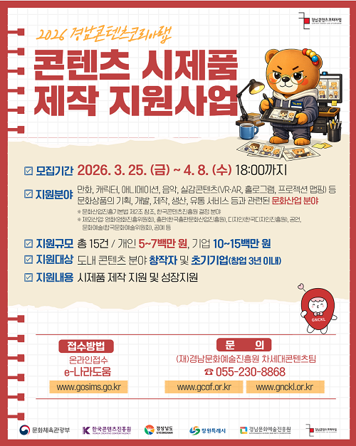 경남도와 경남문화예술진흥원은 2026년 ‘경남콘텐츠코리아랩 콘텐츠 시제품 제작지원사업’ 참여자를 모집한다고 18일 밝혔다.
