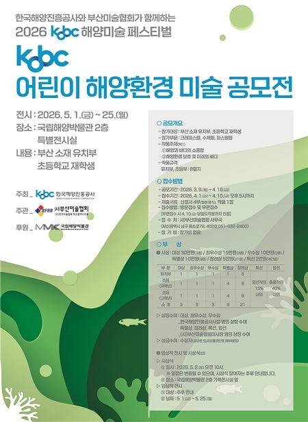 수상작은 5월 1일부터 25일까지 국립해양박물관에서 열리는 ‘2026 KOBC 해양미술 페스티벌’에 전시된다. 특히 개막식이 진행되는 5월 2일에는 공모전 시상식도 함께 열린다.