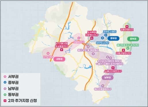 2차 추가지정 후보지는 ▲KTX울산역 도심융합지구 ▲도심융합 다운혁신지구 ▲자동차일반산업단지 ▲AI·에너지 항만지구 ▲강동관광단지 등 5곳으로, 울산경제자유구역청은 연내 산업통상자원부에 추가 지정을 신청할 계획이다.