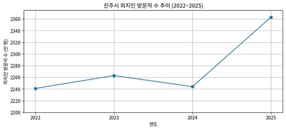 한국관광공사 관광데이터랩 자료에 따르면 진주시 외지인 방문자 수는 2022년 2241만 명에서 지난해 2363만 명으로 약 122만 명(약 5.4%) 증가한 것으로 나타났다. 연도별로는 2022년 2241만 명, 2023년 2263만 명, 2024년 2244만 명, 작년 2363만 명으로 집계됐다.