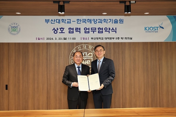 부산대학교와 한국해양과학기술원(KIOST)은 23일 오전 부산대 대학본부 5층 제1회의실에서 '해양·기후 분야 미래인재 양성 및 연구·교육·산학 협력'을 위한 업무협약(MoU)을 체결했다고 밝혔다.