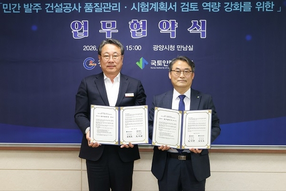 관리원은 이번 협약에 따라 민간 발주 건설공사 품질관리·시험계획서에 대한 광양시의 검토를 지원하고, 기술 자문도 적극 수행할 예정이다. 광양시는 시범사업이 원활히 추진될 수 있도록 관련 자료 제공 등에 협조하기로 했다.