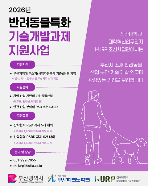 신라대학교 반려동물산업특화 대학혁신연구단지(I-URP) 조성사업단은 부산 지역 반려동물 산업의 기술 경쟁력을 지속적으로 높이고, 관련 기업들의 도약과 성장을 지원하기 위해 ‘2026년도 반려동물산업특화 기술개발과제’ 공모를 추진한다고 7일 밝혔다.