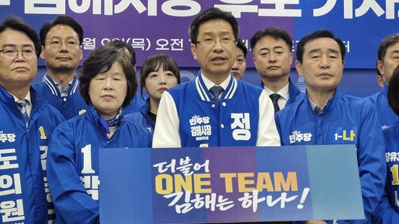 더불어민주당 김해시장 후보로 확정된 정영두 예비후보가 9일 오전 김해시청 프레스센터에서 기자회견을 열고 “원팀으로 새로운 김해 미래를 열겠다”고 밝혔다.