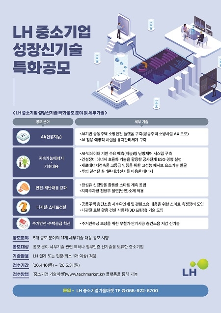 한국토지주택공사(LH)는 중소기업 우수 신기술 발굴 및 성장 지원을 위해 'LH 중소기업 성장신기술 특화 공모'를 시행한다고 16일 밝혔다.