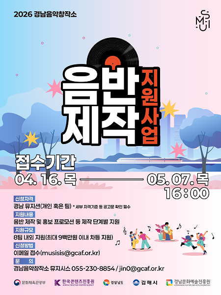 경남도와 경남문화예술진흥원은 도내 대중음악 창작 활성화를 위해 ‘2026 경남음악창작소 뮤지시스 음반 제작 지원 프로그램’에 참여할 뮤지션을 내달 7일 오후 4시까지 모집한다고 20일 밝혔다.