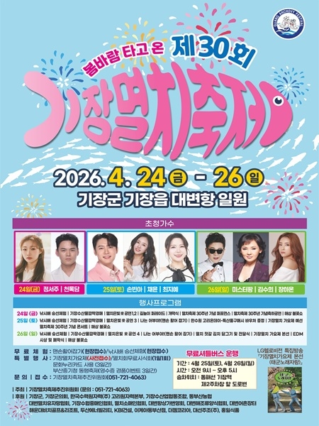 최일천 기장멸치축제추진위원장은 “올해로 30주년을 맞이한 기장멸치축제를 기념하여, 그 어느 때보다 내실 있는 먹거리와 볼거리를 정성껏 준비하고 있다”며 “따뜻한 봄기운 가득한 기장에서 멸치축제의 즐거움을 함께 나누며 특별한 추억을 만들어 보시기 바란다”고 말했다.